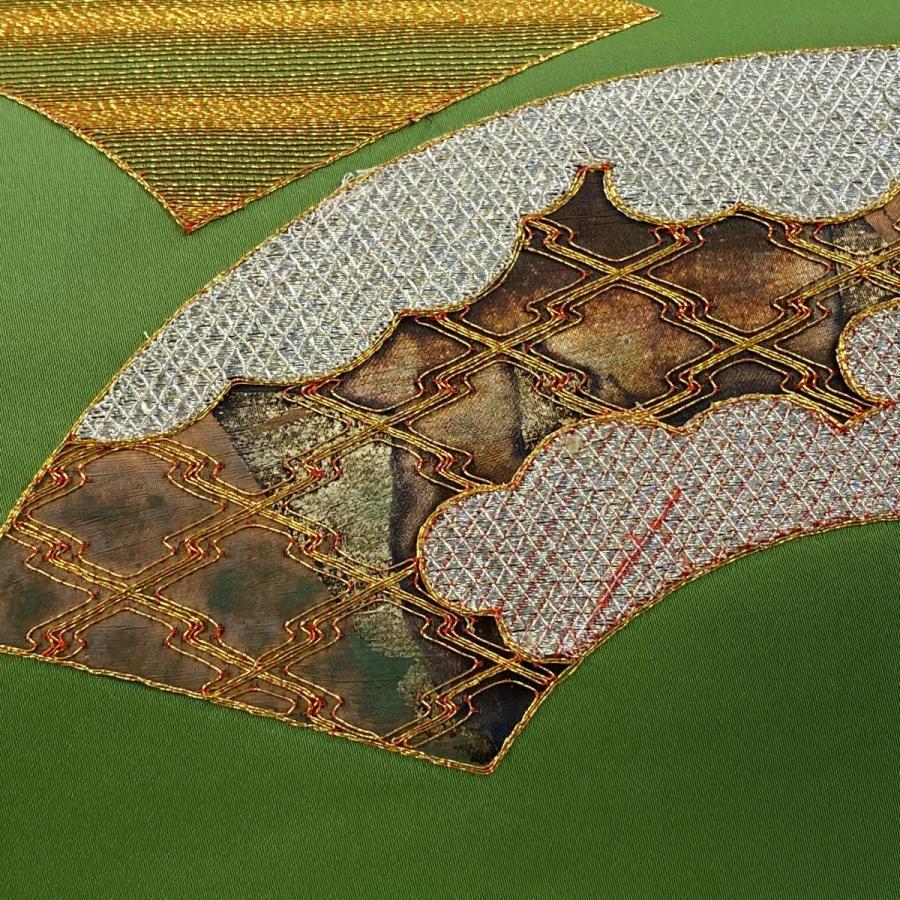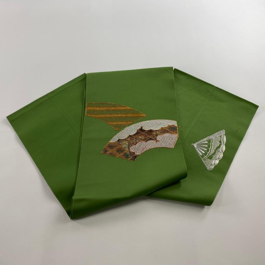 名古屋帯 優品 八寸名古屋帯 扇面 雲文 金銀糸 刺繍 よもぎ色 正絹 中古